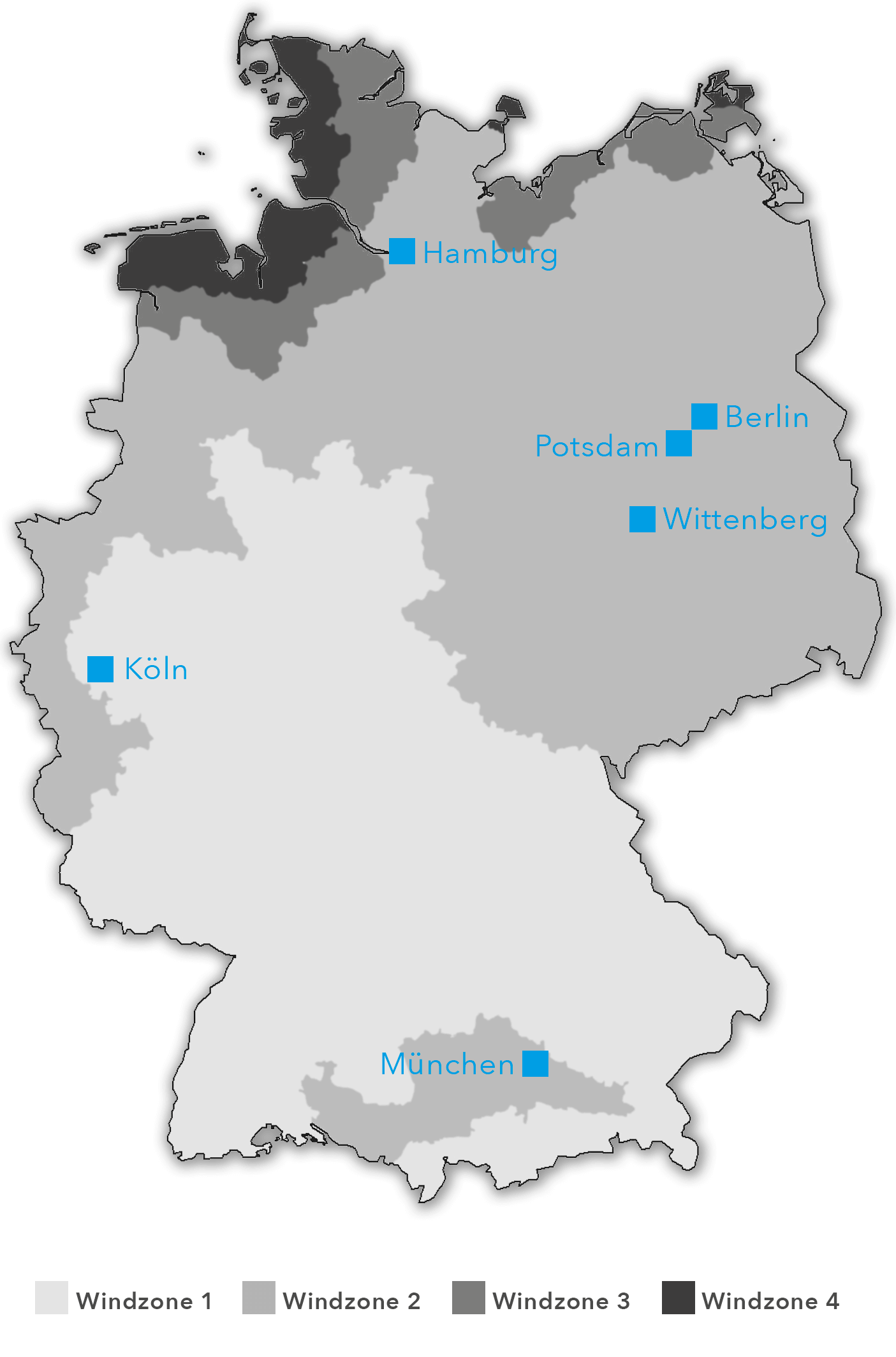 Europaweit gibt es einheitliche Regeln zur Bemessung von Windlasten (Eurocode 1). Deutschland ist in vier Windzonen mit unterschiedlichen Grundwindgeschwindigkeiten unterteilt: